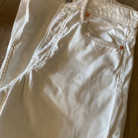 H&M bukser i hvit farge, størrelse 38 for kvinner med midjemål W31. Lengde 32. Laget av bomullsmateriale. Klassisk design med lommer og knappelukking. God stretch. Egnet for hverdagsbruk.