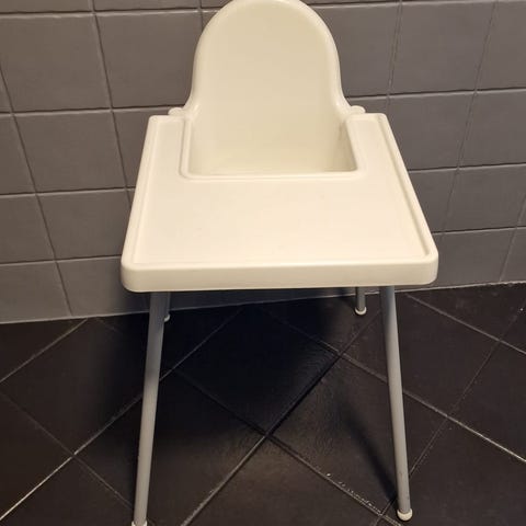 IKEA Antilop barnestol i hvit plast med avtakbart brett. Stolen har mål på 56 cm bredde, 58 cm høyde, og 46 cm dybde. Designet for barn, med sikkerhetssele inkludert.