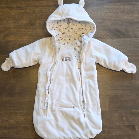Newbie Hvit baby bilstolpose i størrelse 62. Posen har en myk og varm fôring med hette og glidelås foran. Hull til seler. Ingen bruksmerker - ser ny ut med unntak av litt nupper innvendig. Kun brukt et par ganger da baby var svært varm av seg. Kan selvsagt også brukes i vogn.