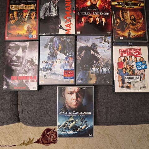 DVD samling med ulike filmer innen action, thriller og drama sjangere. Inkluderer titler som Valkyrie, Spartan, The Watcher og We Own the Night. DVD-ene er i standard format og egnet for avspilling på kompatible enheter.