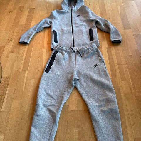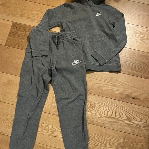 Klassisk gråmelert Nike joggebukse og hettejakke selges. Str. 147-158. Logo på bryst og lår. Selges samlet for oppgitt pris.