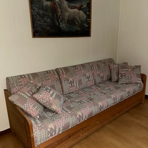 Uttrekkbar Sovesofa i tre, grønne puter. Lite brukt. 75 cm bred når sammen. 136 cm bred når trekt ut. 2 meter innvendig lengde. Også god å sitte i.