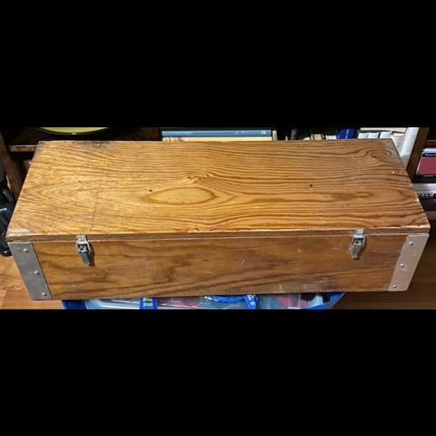 Boksens indre og ytre viser tegn på bruk og patina, noe som indikerer tidligere bruk. Egnet for oppbevaring av diverse gjenstander.