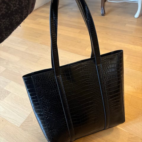 NA-KD Dame Veske i kunstlær i svart. Vesken har en rektangulær form med to skulderstropper og et mønster som etterligner slangeskinn/krokodilleskinn.Passer til daglig bruk