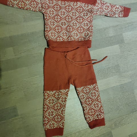 Ull sett med to lag myk ull. Noe misfarger, men har ikke forsøkt å fjerne flekkene. Kun vasket.