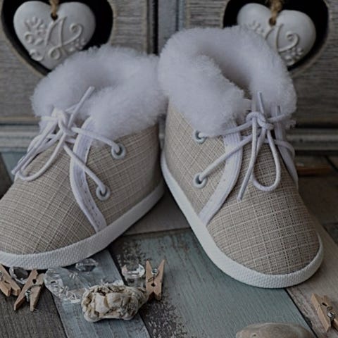 Forsøket barnesko. Til bruk på dåpsbord med feks blomster oppi.