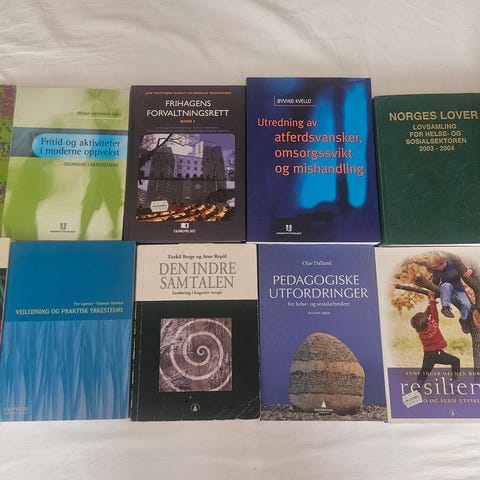 Bøker brukt i utdannelse av barnevern pedagogstudiet. Selges samlet. Må hentes.
