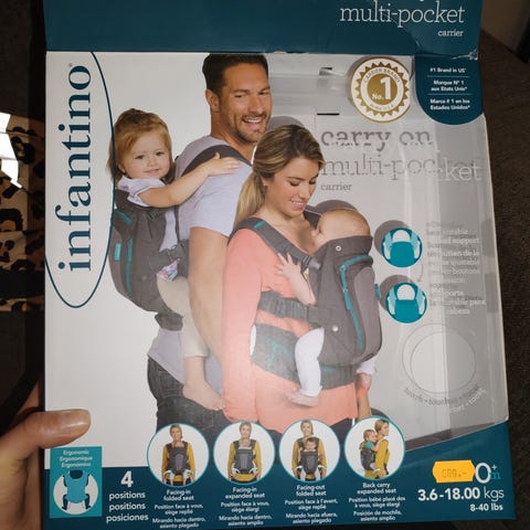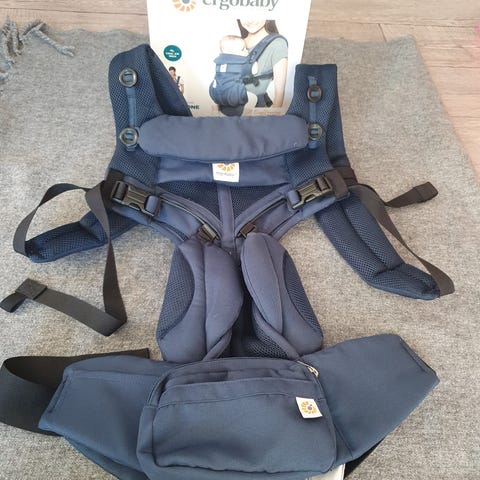 Bæresele, nesten ny. Består av flere deler. Kan brukes til å bære barnet i ulike posisjoner.