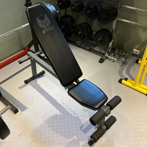 Benken har polstret sete og ryggstøtte, egnet for ulike styrketreningsøvelser. Passer for hjemmebruk og styrketrening.