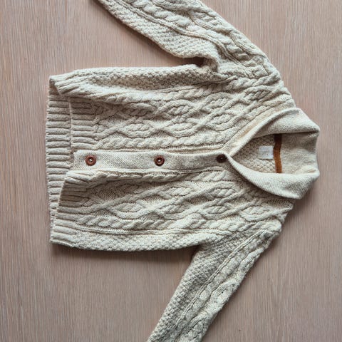 Aran ull strikke jakke barn,eggeskall farge. Usikker på størrelse /evt.alder til barnet.