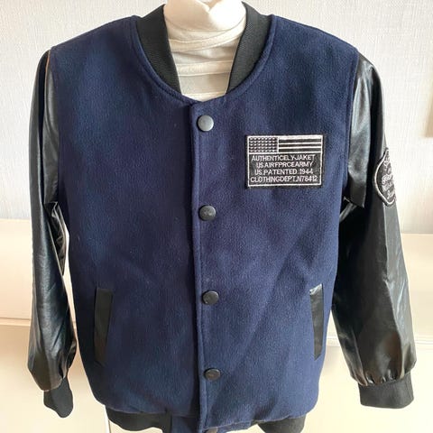Tøff jakke / bomber/ college jakke med ‘skinn’ detaljer mm.