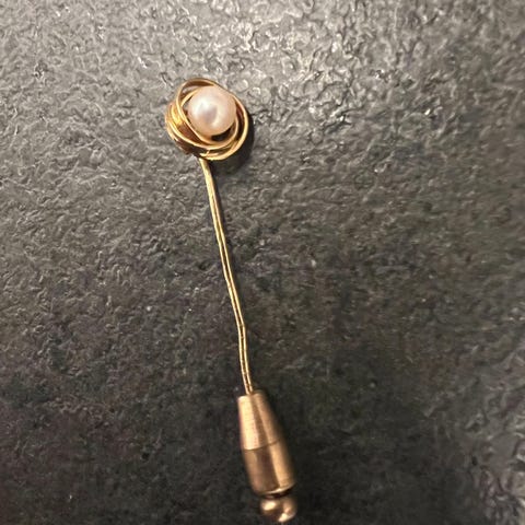 Gullbrosje med ekte perle som dekorasjon. Brosjen har et elegant og tidløst design, og er stemplet 585. Veier 7 gram på min unøyaktige kjøkkenvekt.