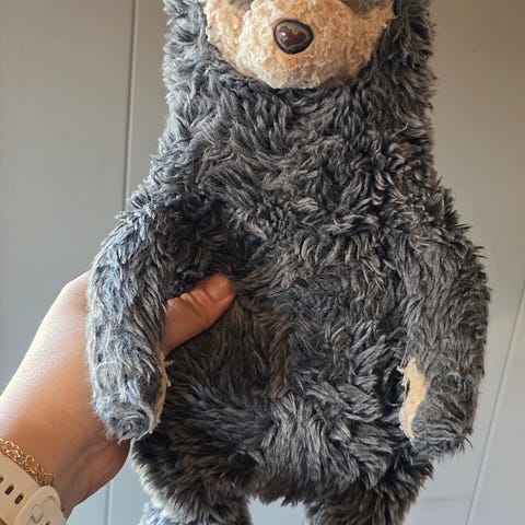 Squishmallows kosedyr i form av en katt med lilla lue. Mykt materiale og rund form. Passer for barn som lek eller kos.