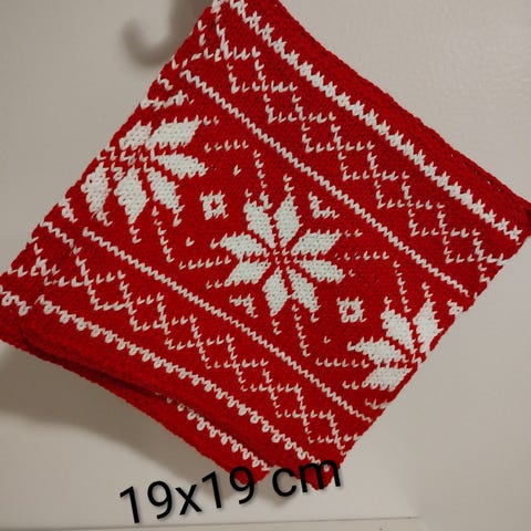 Strikkede grytelapper med grønn og hvit farge. Laget av blandet garnmateriale, egnet for å beskytte hendene når man tar på varme gryter eller tar ut varm mat fra stekeovn o.l.
