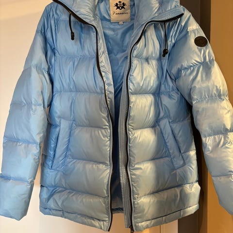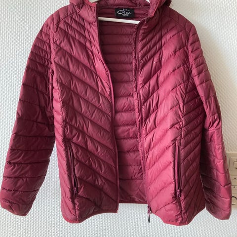 Dunjakke Jazz str42 normal i størrelse. Veldig lite brukt, nydelig dyprød farge. 90% down 10% feather. Lengde 67 cm.