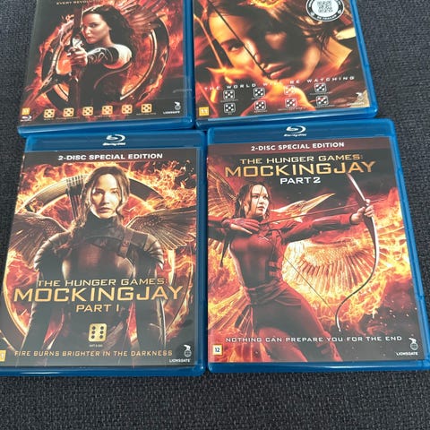 The Hunger Games Blu-ray 4-pack inneholder filmene The Hunger Games, Catching Fire, Mockingjay Part 1 og Mockingjay Part 2. Hver Blu-ray har høy definisjon og inkluderer 2-disc spesialutgaver for Mockingjay filmene. Filmene er basert på bokserien og er i action- og eventyrsjangeren.