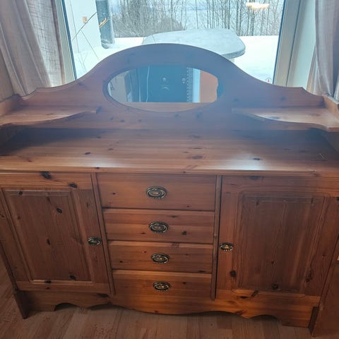 Skjenken har tre skapdører med hyller i hvert skap og tre skuffer til bestikk og annet. Ingen skader.