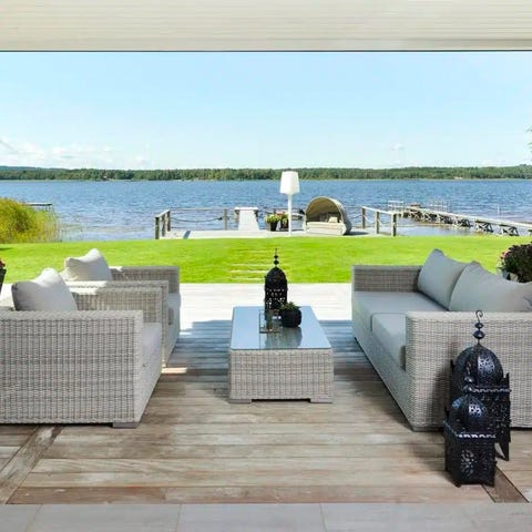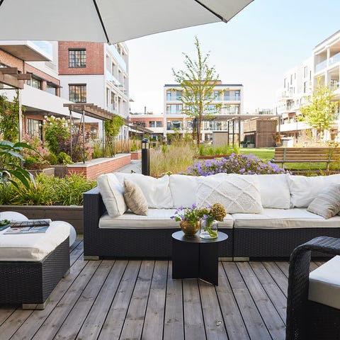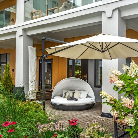 Utemøbel fra denoord. rund solseng med puter og skygge daybed
