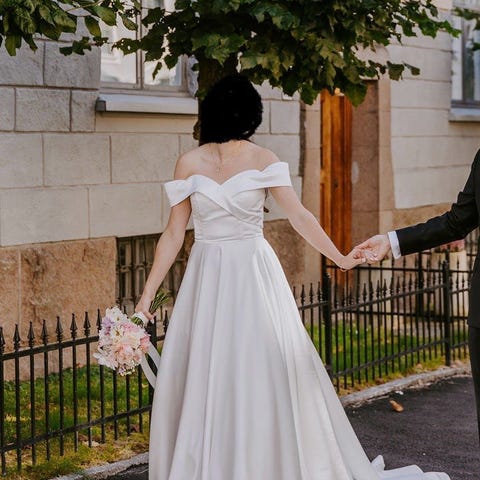 Det er en 2-1 kjole hvor man kan ta av og på ekstra slep. Det er sydd til ermer som også kan tas av og på fra stoffet til noe av slepet. Kjolen har stropper som også kan brukes, jeg har dyttet dem nedi når jeg brukte den. Kjolen er sydd inn i midjen etter min fasong, så vil si den er som en S-XS, opprinnelig str 38. Ikke sydd noe på lengden, jeg er 172 og den er perfekt for meg. Nydelig kysseslør følger også med om ønskelig. Åpen for bud.