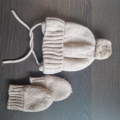 Hjemmestrikket lue og tilhørende votter. Strikket i ca størrelse 9-12 mnd, men vi har brukt det opp til nesten 2 år. Ingen hull eller mangler som jeg kan se. Strikket i garn som er ca 50% ull og 50 % bomull, så veldig mykt og fint garn som ikke klør.