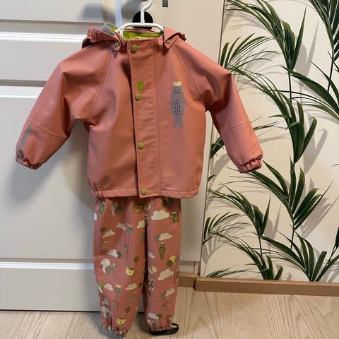 Veldig pent brukt Kattnakken Plask regnsett , brukt av ett barn. Str 92. Ingen stor skaden eller slitasjen.