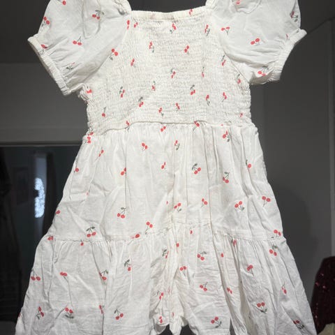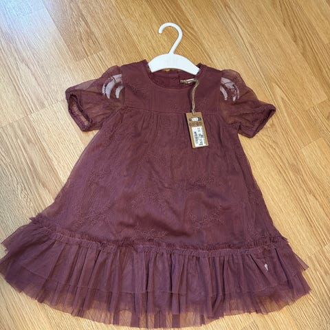 Newbie Jente kjole i størrelse 92, farge grønn. Kjolen har volanger og et mønster med små prikker. Materiale er ikke spesifisert, men kjolen har en lett og luftig design som passer til barn. newbie dame kjole er i str S.