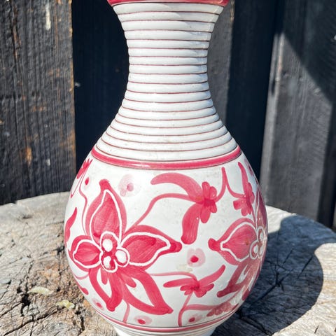 En pen Sintra Keramikk vase. Den er håndmalt med rød dekor. Vasen er signert Sintra 99. Den har litt krakelering, se bilder. Bortsett fra det er den i god stand, ingen nagg eller sprekker. Vasen er 15 cm høy.