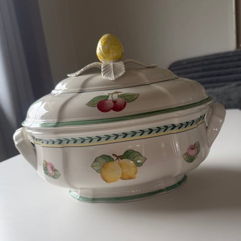 Fin stand, men et lite skår på formen med sitroner på og en limt skade på formen med bær - se bilder.