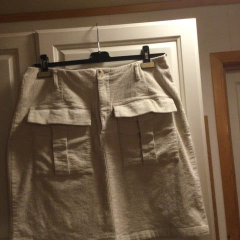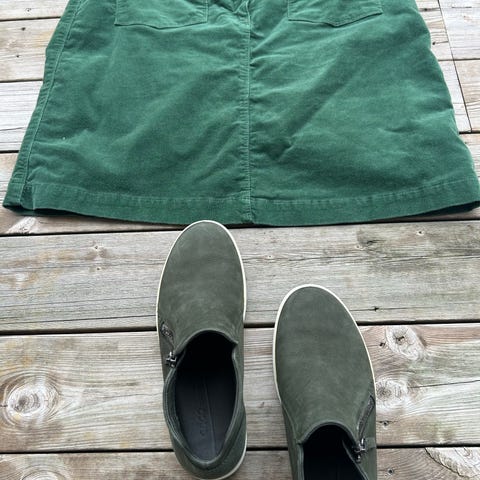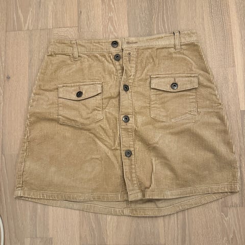 Morris Lady cordfløyel skjørt i olivengrønn farge, størrelse 42. Skjørtet er solid, men myk i stoffet- har knappelukking foran og to store lommer foran. Pent brukt, ingen synlige bruksmerker. Rekker til midt på knær for person ca 170 cm.