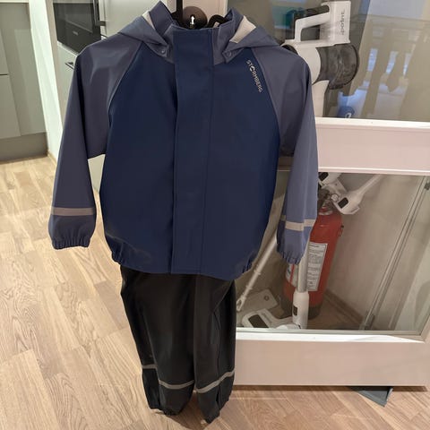 I god stand, men litt slitasje i halslinningen ved glidelåsen og nederst på buksebena (se bilder).