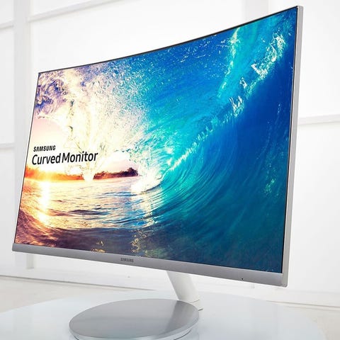 Samsung C27F591 Curved 27" Skjerm med buet design. Skjermen har en størrelse på 27 tommer og er hvit på baksiden med en rund, stabil fot. Den har HDMI-tilkobling og er egnet for generell bruk som kontorarbeid eller underholdning.