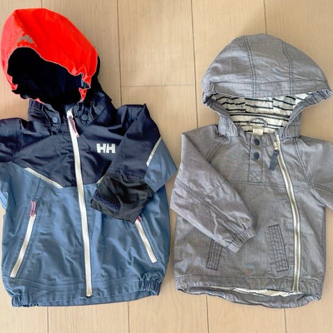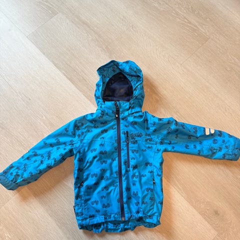 Hel og fin jakke fra Helly Hansen. Str. 86, men jeg synes den er litt stor i størrelsen. Lett, pustende og vanntett. Morsomt mønster med båter som motiv.