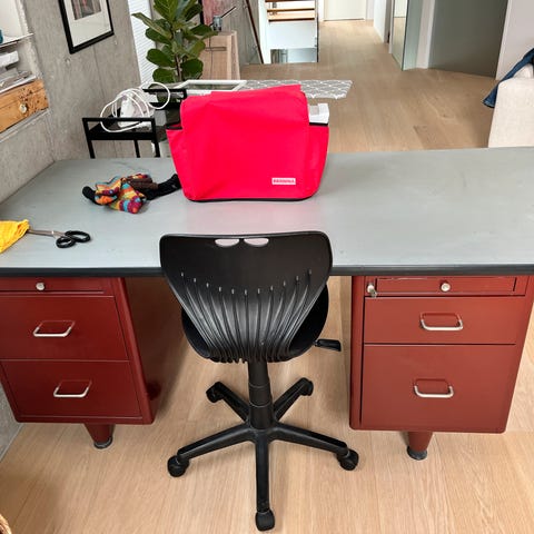 nydelig vintage skrivebord i tre og skinn med skuffer og skap på begge sider.