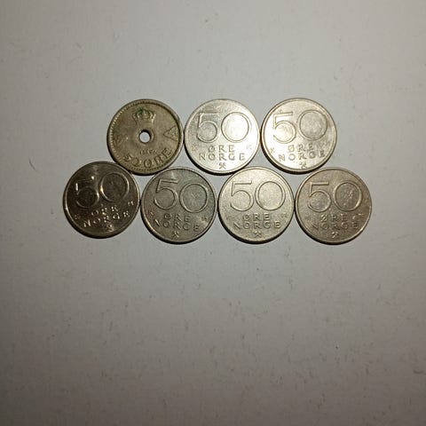 50-øringer (53 stk) 1 stk kronestykke og 1 stk 5-Øring