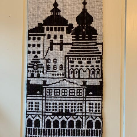 Søkeord: broderi, brodert, klokkestreng, åkle, klostersøm, teppe, billedvev, veggteppe, ull, redesign, retro, rustikk, gobelin, tekstil, middelalder, ridder, smijernsbeslag, tradisjon, håndlaget, hjemmelaget, husflid, tekstilkunst, festdrakt, bunad