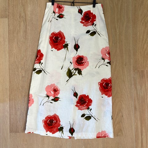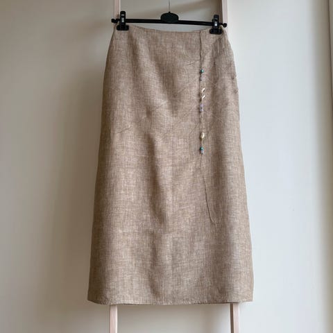 Vintage langt foret skjørt i 100% lin fra Tara str. 44. Lite i størrelsen mer som 42. Rett i fasongen, Linning med beltestropper, glidelås i sidene. Splitt bak med store knapper. Linning 94 cm, lengde 88 cm.