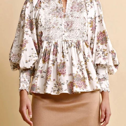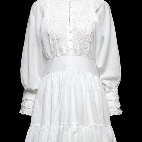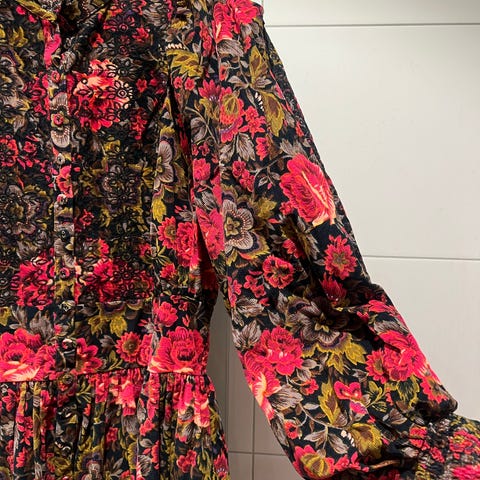 Kjolen har rund hals, voluminøse lange ermer og god vidde i skjørtet. Den har broderier og knapper på brystet, er innsvingt i midjen.