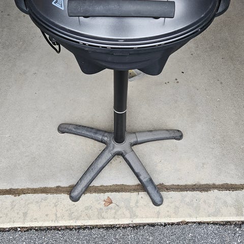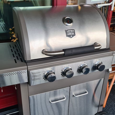 Austin and Barbecue elektrisk bord grill med innebygd termometer på lokket for temperaturkontroll. Grillflaten er delt i to seksjoner, en med riller og en flat, som gir mulighet for variert grilling. Grillen har et svart ytre og et låsesystem foran for sikker lukking. Passer for innendørs bruk og enkel rengjøring. Kjøpt ny av meg på netonnet sommeren 2025, selges grunnet lite bruk