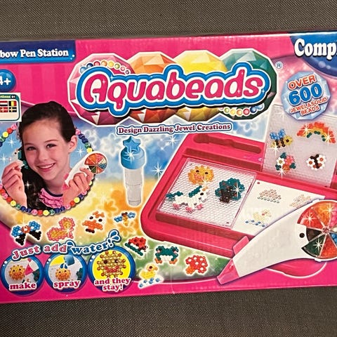 Masse perler igjen. Du lager et motiv, sprayer på vann, så blir det figurer. Gøy å leke med, og barna kan sitte i timesvis og lage forskjellige ting.