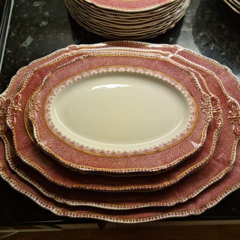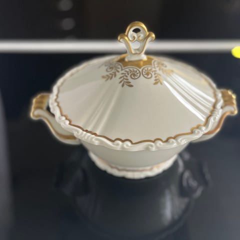 Vakkert dekorert med gull og har flott mønster i selve porselen. Ingen skår. Pent brukt. Selges som deler, pris og antall står på bilder. Totalt 32 deler. Pris for alle deler 4820 kr, hvis du kjøper hele service for du det for 3500 kr. Pakker veldig godt ved sending.
