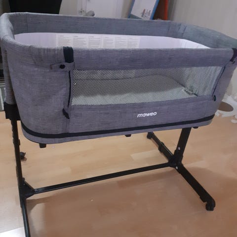Fin, praktisk bedside crib fra Moweo med en myk, polstret madrass og oppbevaringsveske.