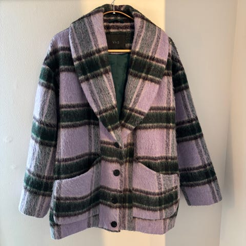 Pent brukt fôret dobbeltspent jakke fra By Malina i fin rutete fargekombinasjon lilla og mørk grønn.