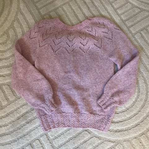 Rosa og sort genser i gann dis garn. Kan brukes fra str s -l ettersom hvor oversized man vil ha den.