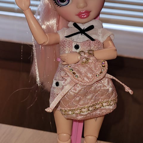 Dukken ble kjøpt ny i eske av meg, åpnet og stått på en hylle. Ikke lekt med.