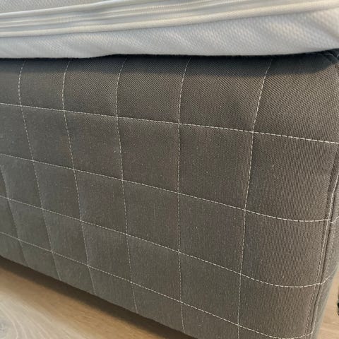 Selger en flott og moderne sengegavl i eksklusiv, mørk blå fløyel (ser nesten svart ut). Gavlen har ramme i trelook og en myk, polstret front med horisontale sømmer som gir et stilrent preg.