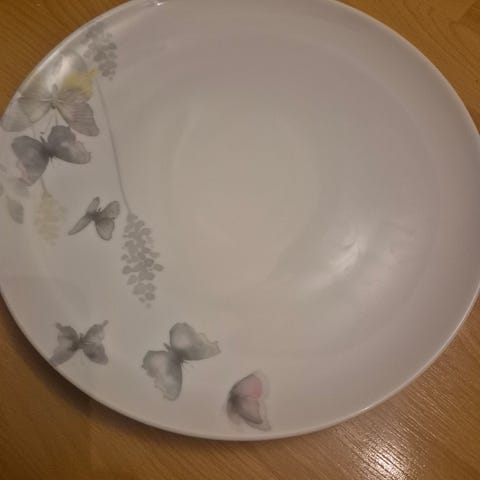 Ganske nytt servise fra europris selges, 6 frokostfat, 6 middagsfat, 6 skåler og 6 krus.