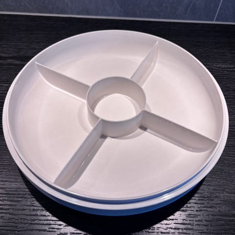 Tupperware serveringsfat med flere bruksmåter. Perfekt til tapas, grønnsaker og dipp etc. kan brukes med eller uten "rommene". Det hvite kan og brukes som lokk.