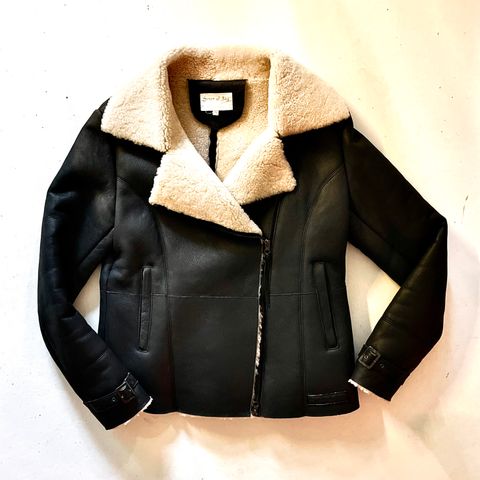 Fin Teddy jakke m/skinnermer fra Only i str XS. Pent og lite brukt. Den er ikke direkte stor i str, men kunne vært str XS/S. Jakken er i polyester og PU skinn.