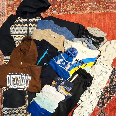 5 langermet jumpere, 1 hettejakke, 1 vest med hette og en pysjamas-bukse