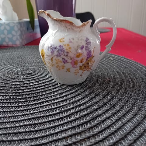 Antikk fløtemugge i porselen påmalt lilla og hvite blomster.